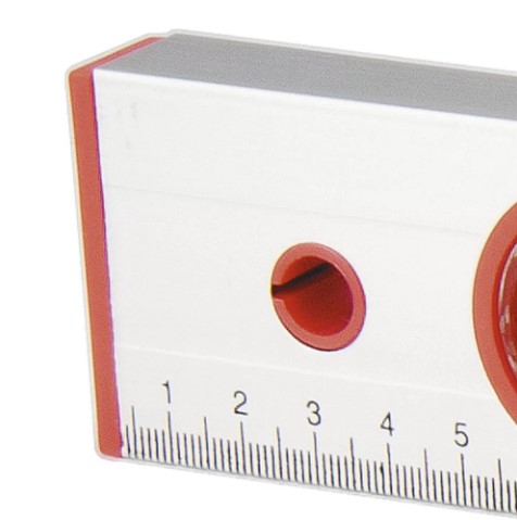 Nível produzido de perfil retangular de alumínio com bolhas para aferição de desvios horizontais e verticais.