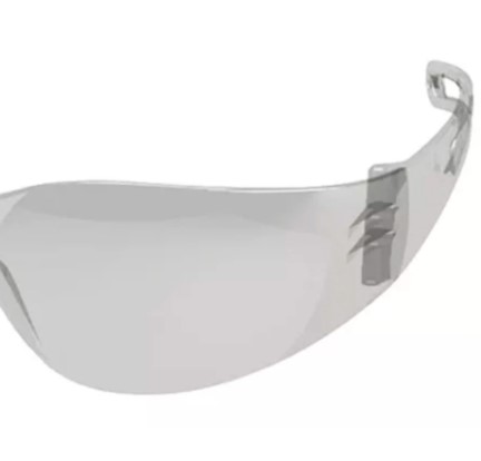 Este modelo apresenta lente incolor em policarbonato com formato que cobre as laterais dos olhos e proteção contra raios UVA E UVB