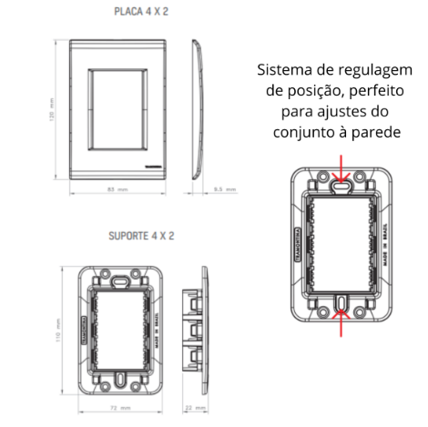 - Furo oblongo, que facilita a fixação e a regulagem da placa à parede e evita que ela fique desalinhada.