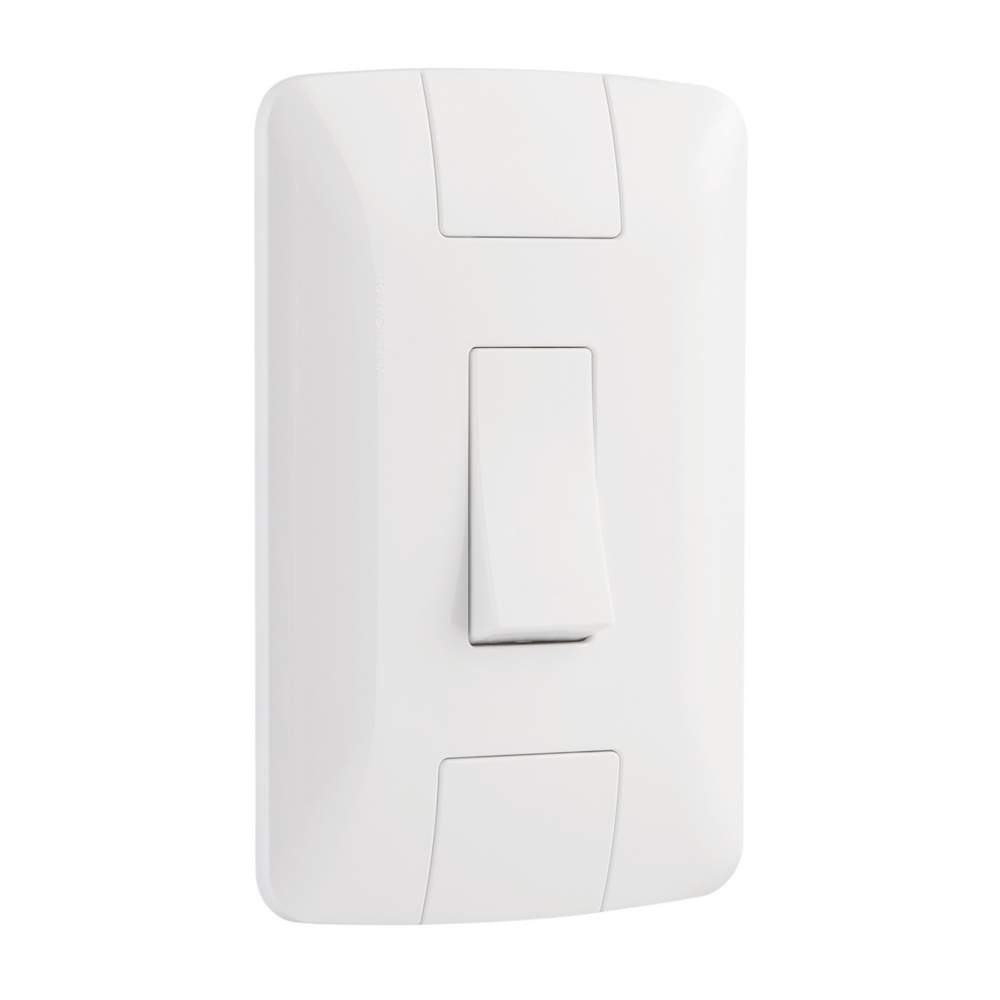Este conjunto 4×2 conta com um interruptor bipolar simples, ideal para controlar circuitos de duas fases, por exemplo, em instalações 220 V.