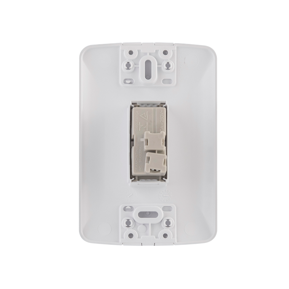 O suporte é modular, e o furo oblongo facilita a fixação e regulagem da placa na parede, deixando-a alinhada. A fixação dos bornes é feita por parafusos, garantindo firmeza na instalação.