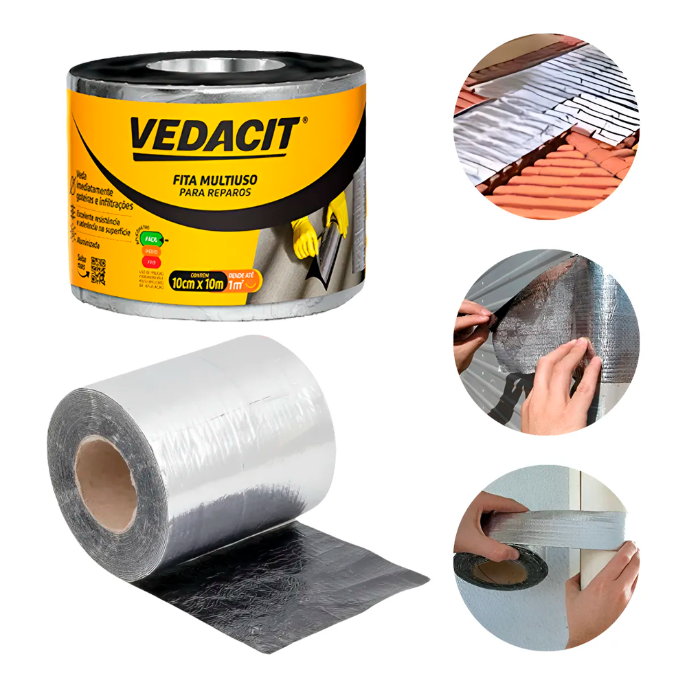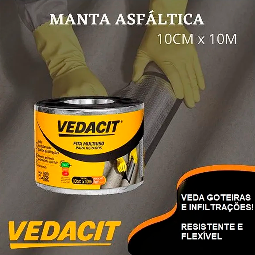 A Fita Asfáltica Alumínio 10cm x 10mts - VEDACIT é uma solução prática e eficiente para vedação e impermeabilização de diversos tipos de superfícies.