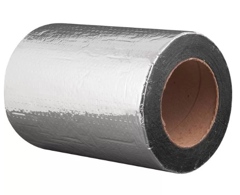 Fita autoadesiva multiuso à base de asfalto, protegida com filme na cor cinza que permite sua exposição a intempéries e aos raios solares, para solucionar problemas de gotejamento e vedações.