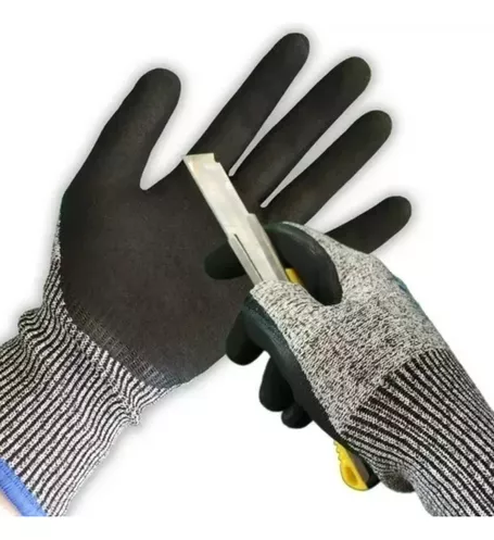 Luva de segurança confeccionada em fibras sintéticas, HPPE (polietileno) 13 gauge, revestida em nitrila tipo sandy (areia) na palma e ponta dos dedos, punho com inserção de fibras elásticas e acabamento em fibras sintéticas.