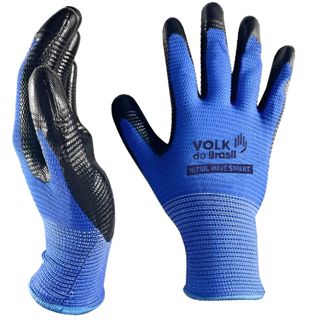 Luva de segurança confeccionada em fibras sintéticas, 13 gauge, revestida em nitrila na face palmar e ponta dos dedos, punho com fibras elásticas e acabamento com fibras sintéticas.