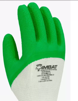 Luva confeccionada em fibras naturais e sintéticas, com banho de látex natural corrugado na palma, face palmar e pontas dos dedos.