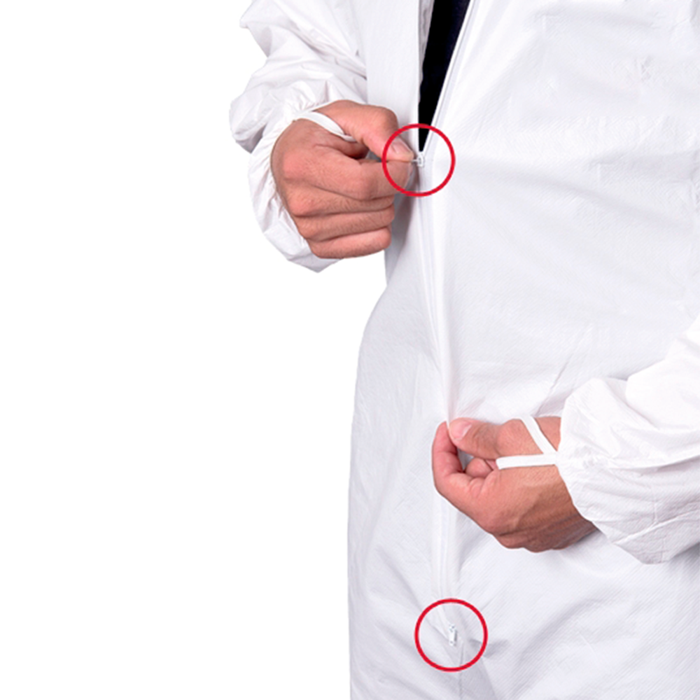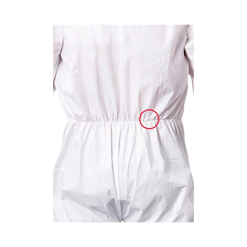 Macacão de segurança confeccionado em tecido laminado microporoso; capuz, fecho frontal em zíper de duas vias, laços nos polegares, elástico na metade da cintura, pulsos e tornozelos, emendas costuradas, tecido com tratamento antiestático.