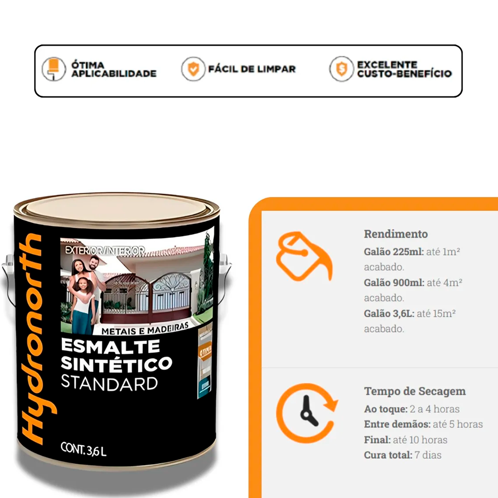 A Tinta Esmalte Sintético Standard Hydronorth é ideal para acabamento em superfícies de madeira e metal, oferecendo proteção, durabilidade e acabamento acetinado.